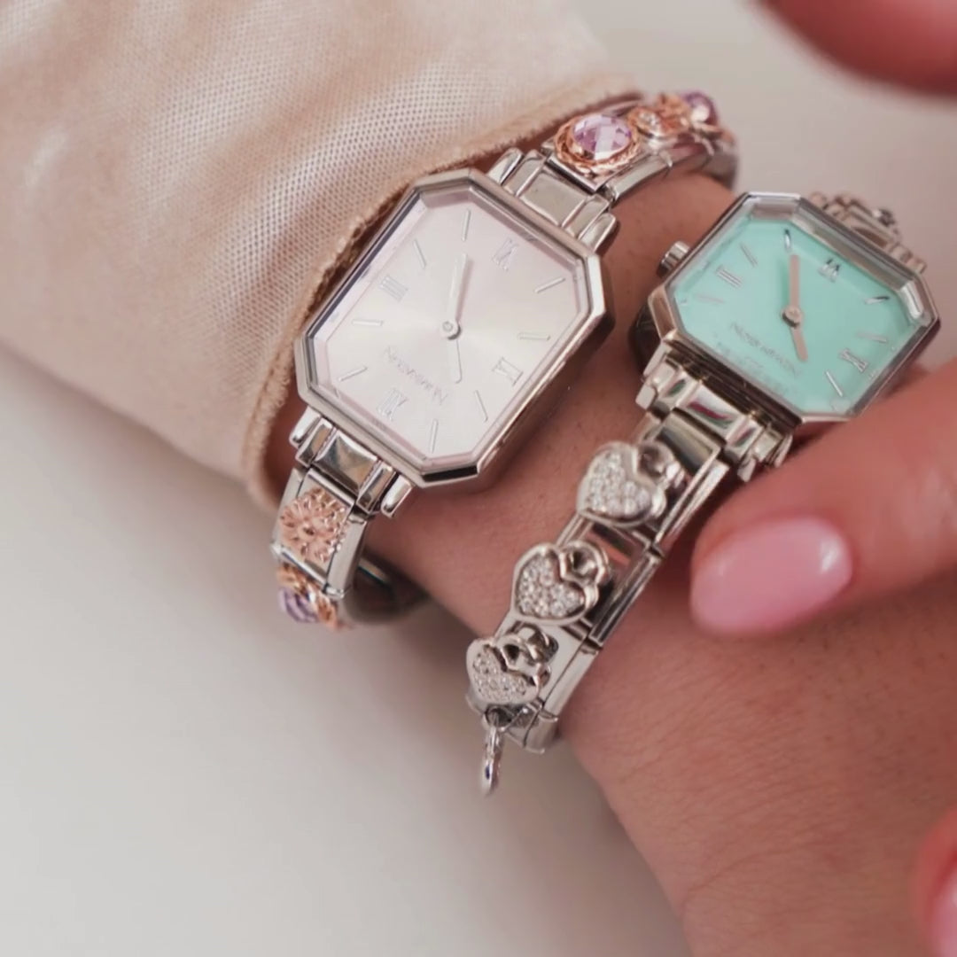 Paris watch with new rectangular steel strap in green water. Personalized watch with Composable® links. Make it your own.